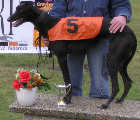 To už jsme měli cca dva měsíce Suri a já si řekla, že jeden chrt nestačí a Suri že potřebuje parťáka. No a náhodou při mém každodenním :)) pátrání po všech možných informacích o chrtech jsem narazila na inzerát daruji greyhound - jako společník , vyřazený exdostihák. Prý nemá dostatečný zájem o návnadu. Začala jsem jen tak informativně s majitelem komunikovat .. a už se nám tu válí na gauči. Byl dovezen pro dostihové účely z Irska. Zatím nemá žádné potomky a není kastrovaný.